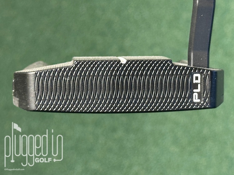 A closer look reveals some nice milling and shaping hidden in the all-black finish.  The face has an attractive deep mill pattern with the “PLD” branding on the very far heel side.  On both the heel and toe sides, the putter angles toward the center, pouring the focus into the alignment line.  The matte black stepless shaft is a nice touch that gives the putter a cohesive look.