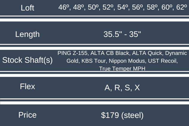 From elite spin to a multitude of sole options, there’s a lot to like about the PING s159 wedge. This club looks great at address and in the bag, giving better players the confidence to attempt heroic rescue shots. Work with your fitter or PING’s online tool to find your perfect grind and enjoy an improved short game.