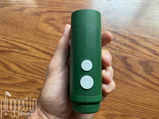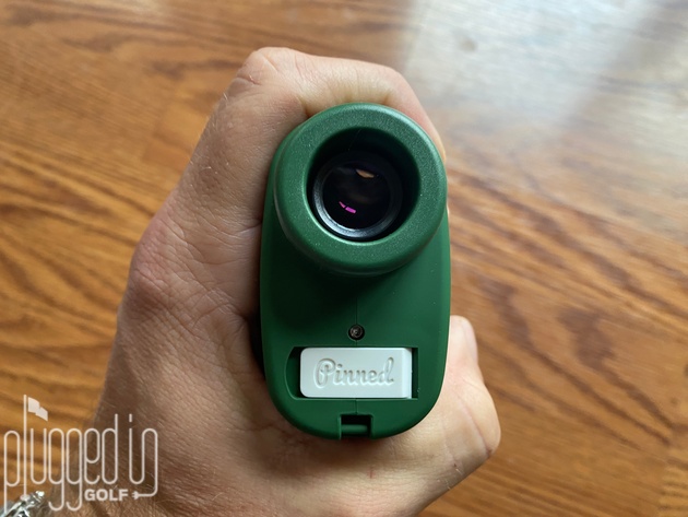 The Pinned Golf Prism rangefinder comes out of the box ready to use. Like most rangefinders, it has two buttons on the top. The power button turns it on and brings up your distance. The “Y/M” button switches the units between meters and yards. There is also a slide on the unit’s side which turns the slope adjustment on and off.