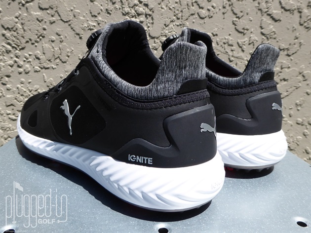 Back up top, the heathered grey seems the perfect complement to the solid black and white elements. The DISC knob can be a bit visually jarring at first, but overall the DISC System gives the shoe a modern edge. The IGNITE PWRADAPT DISC golf shoe also comes in Quiet Shade (grey) and Peacoat (blue).