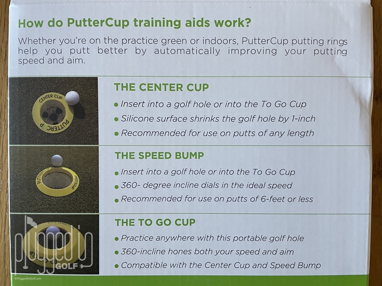Having spent time with all three PutterCup training aids, I think they are all effective. The To Go Cup allows you to practice anywhere and raises the bar slightly. The Center Cup gives you a mental edge, making the real cup seem larger, and the Speed Bump forces you to putt with a confident pace and precise line.