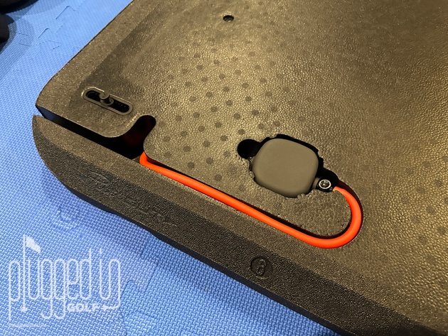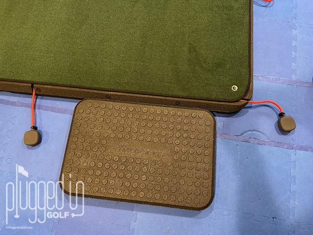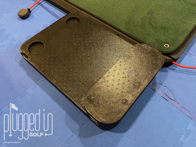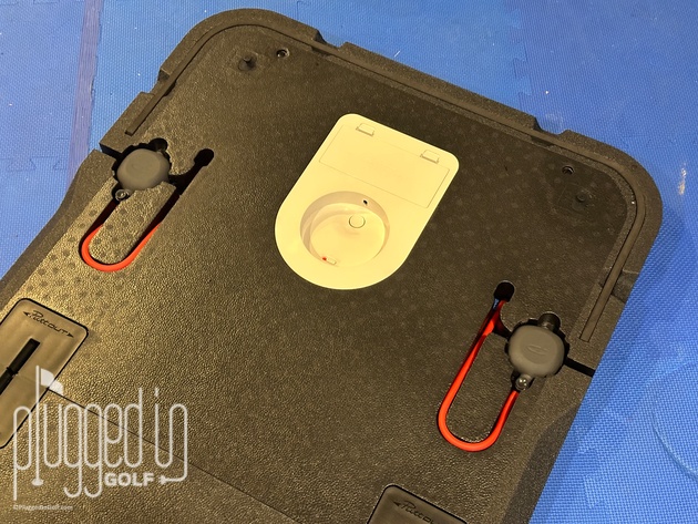 You start by unfolding the platform, which is all one piece. Unpack the pumps – they’re already put together and neatly tucked into the platform – and lay the putting mat on top. There are grommets on the putting mat that fit over adjustable plastic pegs to keep it in place. Turn on the ball return, and you’re ready to putt.
