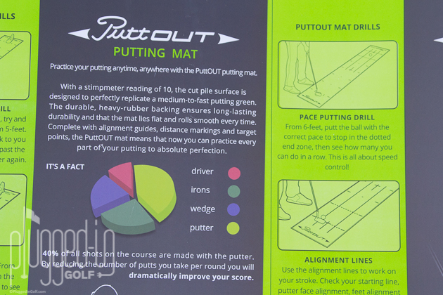On its own, the PuttOut Putting Mat is a solid putting surface that gives you realistic roll.  It has a handful of marks for alignment, distance control, and targets, and the packaging suggests several drills to do.
