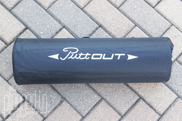 The PuttOut Putting Mat comes rolled up in a cardboard tube inside of a black carrying sack.  When you roll it out, it actually stays flat thanks to the heavy rubber backing.  The heavy backing and and cardboard tube also make it easy to roll the mat up and store it.