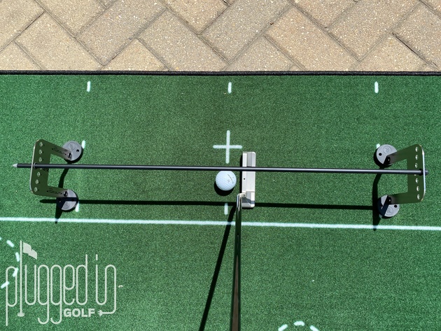 Let’s start by outlining the uses of the PuttOUT Putting Plane Alignment Stick Set. Using all the pieces of the kit, you can create the putting plane, shown above. This can be set at four different lie angles for both right and left handed golfers. You can also remove the plane and use an alignment rod as a guide for the putter shaft. Next, you can putt through the gates, with or without an alignment rod above the ball. Finally, you can pair the alignment rods with the PuttOUT Pressure Putting Trainer [review HERE] to add an alignment check (see below).