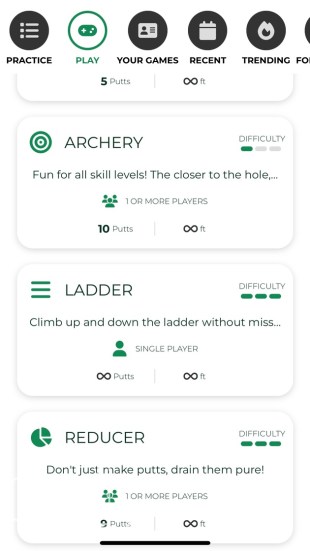 The app is very easy to use. There are icons for Practice, Play, Your Games (you’re able to create your own games within the app), Recent, Trending, and Following (to check in our your friends). Once you pick a mode, the display shows you exactly where to line up the ball and the green reads whether or not your putt was successful.