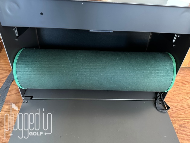 Flip down the door/ramp on the front and you’ll find all the pieces wedged inside – the green (rolled up), and ball return (in pieces), the power adapter, and the phone stand. Once you get them out of the box, set up is quick and easy – unroll the mat, put together the magnetic ball return, and plug it in.