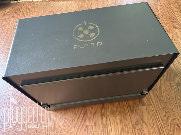 The PUTTR Smart Putting Green comes in a very large, rectangular cardboard box. When you open it, you’ll find a large metal box (2′ X 1′ X 1.5′) weighing about 35 pounds. Not your normal putting green.