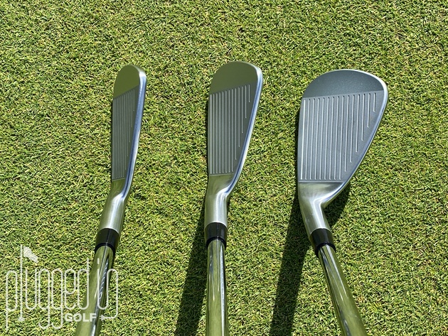 It should also be noted that there’s a difference between the back of the 3-5 irons and the 7-GW. In the higher lofted irons, the back is a pure blade. In the long irons, there’s a small trapezoidal cavity near the top.