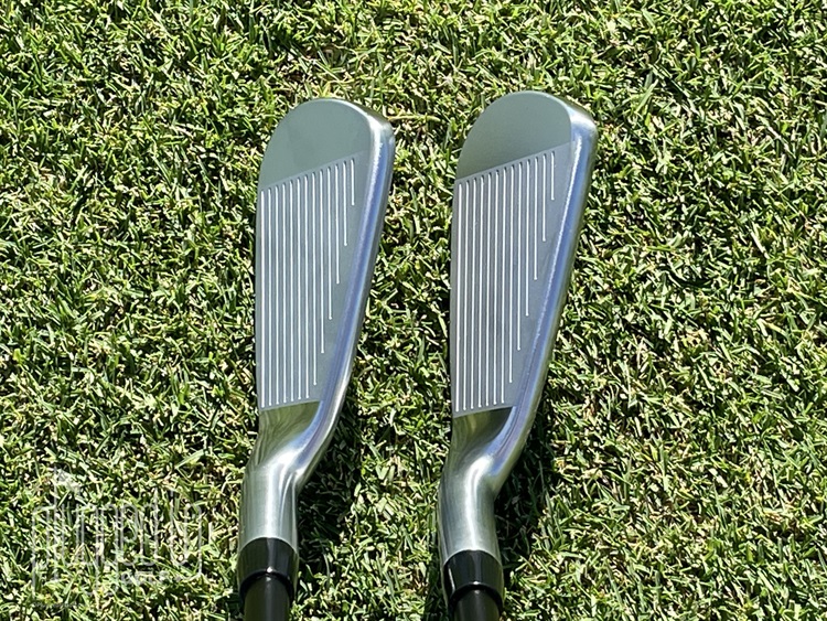The 0311 XP GEN7 irons (right in the above photo) are slightly, but noticeably, larger than the 0311 P irons. At address the blade length is longer and there’s more offset. I like how the matte finish of the hitting area frames the golf ball, and I always appreciate a white bottom groove to aid with alignment. The 0311 XP GEN7 irons offer a comforting size for golfers who sometimes struggle to make good contact.