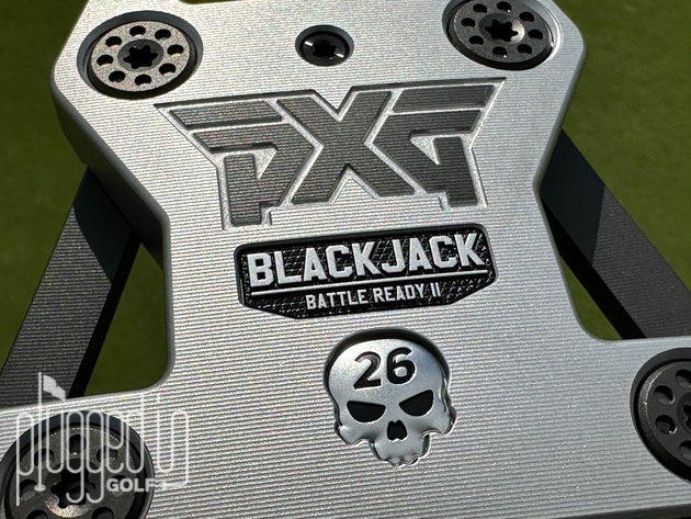 The sole of the PXG Battle Ready II Blackjack has a lot for your eye to take in. Surrounded by four movable weights, the center of the sole features a large PXG logo above the Blackjack and Battle Ready II branding. Nearest the face, you find PXG’s trademark skull with “26” on the forehead.