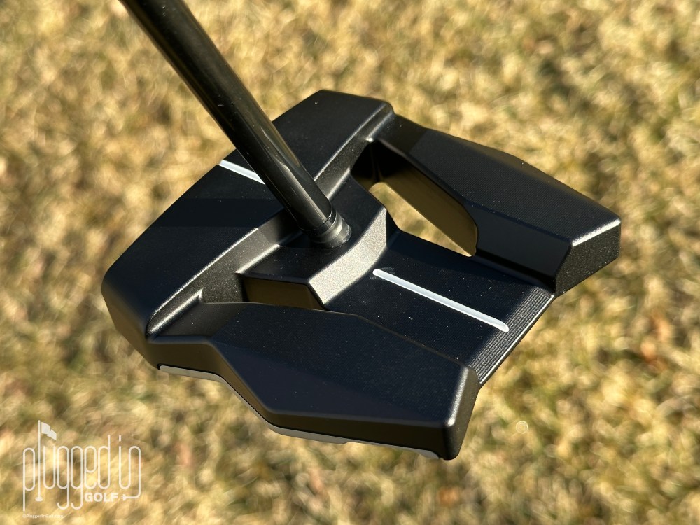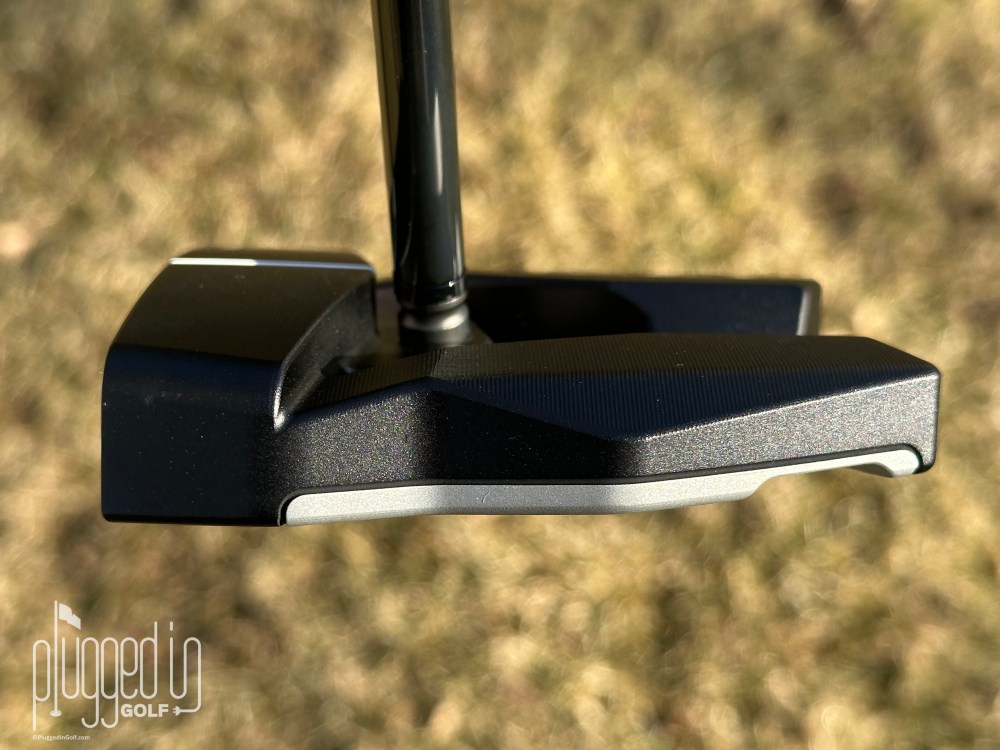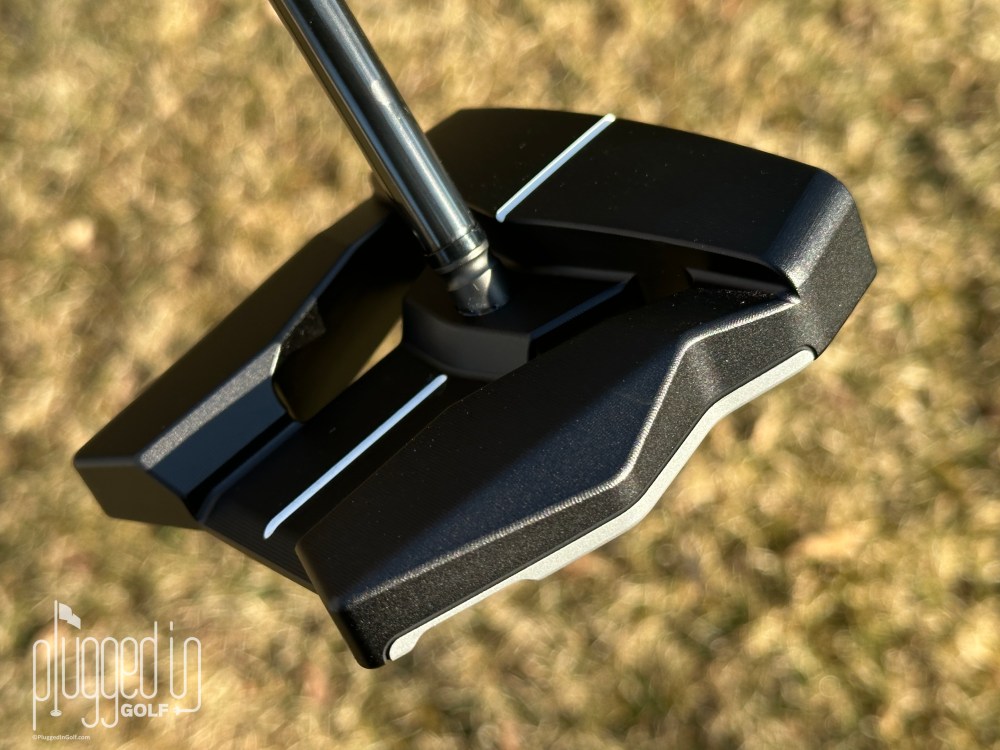If you’re looking for a putter that embodies the modern, angular, spaceship-style mallet, the PXG Hot Rod ZT putter is it.  It has a big footprint – roughly 3.5″ heel to toe and 3.75″ front to back – and a lot for the eye to take in.  Starting at the face, the Hot Rod ZT swells, tapers, and swells again before tapering to the edge of the flange.  There are also several levels that ramp up and drop off into each other.  However, because the putter is entirely black, the overall look isn’t as busy as the description would lead you to believe.