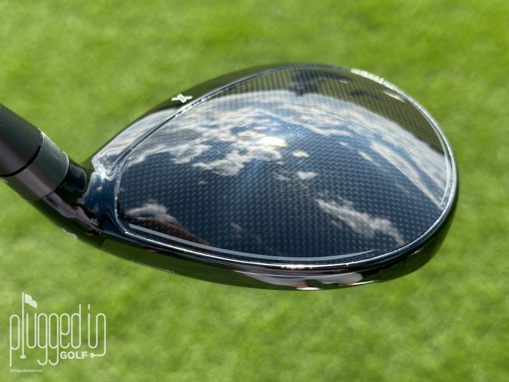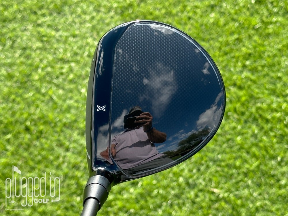 The address look of the PXG Lightning fairway wood is consistent with the Lightning drivers. Its crown is shiny, black carbon fiber with a white “X” alignment aid. In terms of size, this is about average for a modern FW. The shape isn’t quite symmetrical, but it’s balanced.