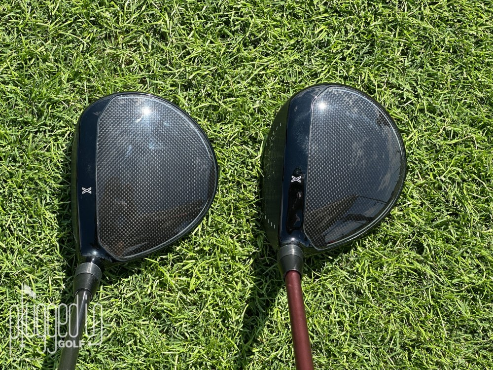 Above, you can see the PXG Lightning fairway wood on the left, the Lightning Tour on the right. Though somewhat minimized by the angle, the difference in size is still noticeable. The Lightning Tour is a compact, players fairway wood. To my eye, the bigger difference is the shape of the face (which is a bit hard to see in this picture). The standard Lightning fairway wood has a squared face, the Lightning Tour has a substantially rounded face.