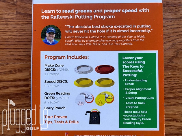 The Raflewski Tour Putting Program comes with all the pieces you see above: two Make Zone Discs, two Speed Discs, ten Green Reading Dots, and a carrying pouch.