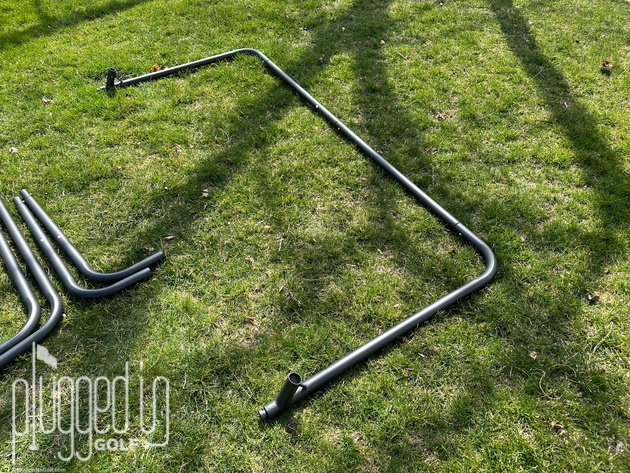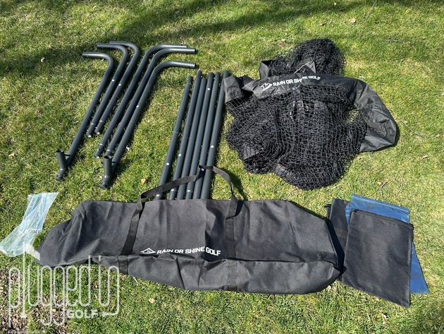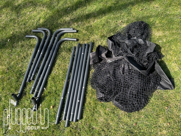 The Rain or Shine SwingNet Pro golf net arrives in a big, heavy box loaded with pieces. You’ll find the netting,sandbags, frame pipes, duffle bag, stakes, and installation manual. Laid out and freed from all the plastic and cardboard, it can be a little intimidating (above).