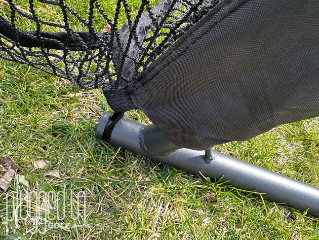 Another thing that I like about the Rain or Shine SwingNet Pro is the way the net connects to the frame. The net is sewn to a heavy canvas sleeve that wraps around the poles. This means you don’t have to worry about a velcro strap coming loose and leaving a gaping hole in your net. The netting also connects to the bottom of the frame (above) so even the occasional worm burner can’t sneak past.