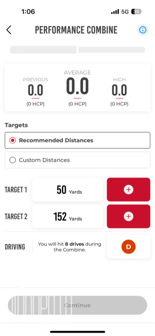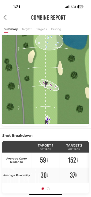 Combines and Simulation are unlocked with the Premium Membership, and they add a lot of fun and variety to your practice. In the Combine, you hit your driver and to two target distances. After a series of shots, a score is generated which you can work to improve over time.