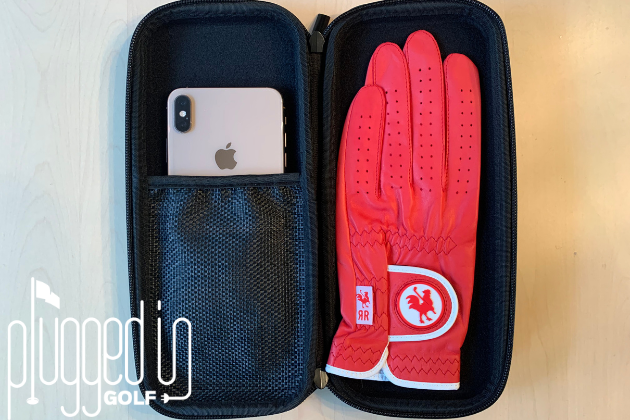 Coming in three colors, black, grey, and red, these compartments feature a zippered hard case on the outside, with a plush lining on the inside.  After zipping it open, one side is dedicated to the glove while on the other side, there’s a pocket for anything else you’d want to store.  It’s large enough to carry 3-4 gloves in that right pocket and also features Velcro pads on the outside to stick a glove to it while you putt.