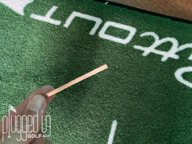 The one piece that’s a bit unusual is the magnet (shown below). Reputt comes with several very thin, narrow magnets that connect the device to the end of your putting mat. Per Reputt, your mat needs to be at least 8mm thick to work. They suggest adding a yoga mat underneath your putting mat if it is too thin. I found the magnets held fairly well to my PuttOut mat [review HERE], though the rounded edges weren’t ideal for the flat magnet.
