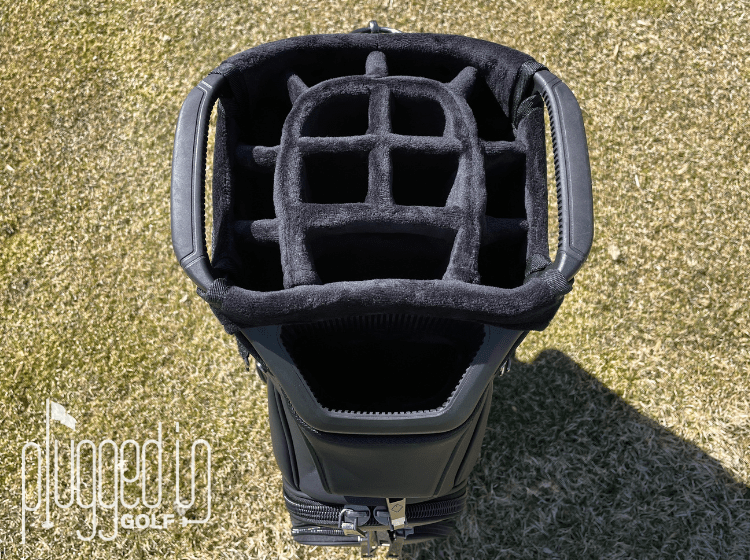 When I think about what makes a cart bag great, I have to start with the divider system. RevCore’s 14 way full length dividers are wide and offer space for clubs to move in and out with ease. The velvet lining is protects the shafts from unnecessary scratches or abrasions.
