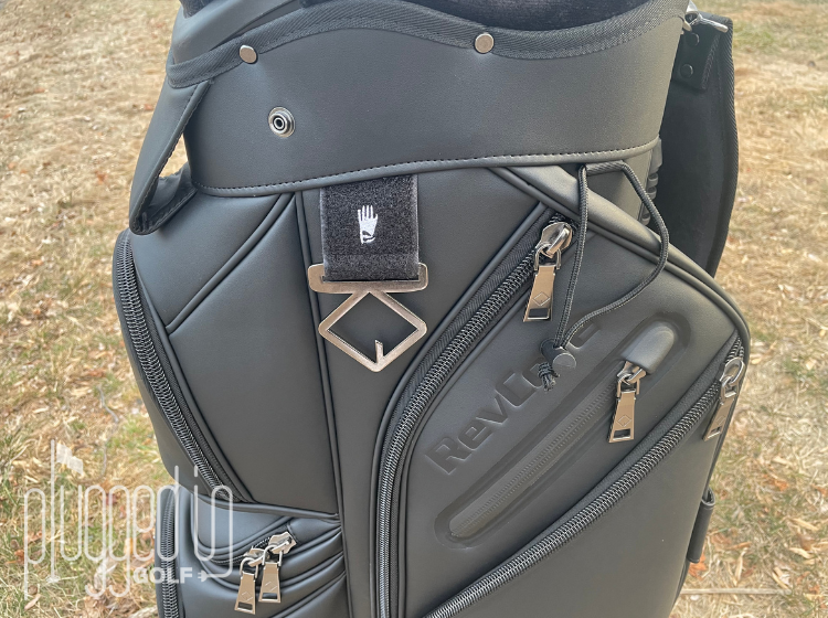 As I mentioned above, the 2025 RevCore Lux Cart Bag has a symmetrical theme. Each side features a towel ring, velcro patch, and three pockets. The three storage areas include a large garment pocket, a velvet-lined valuables pocket, and an oversized cooler pocket.
