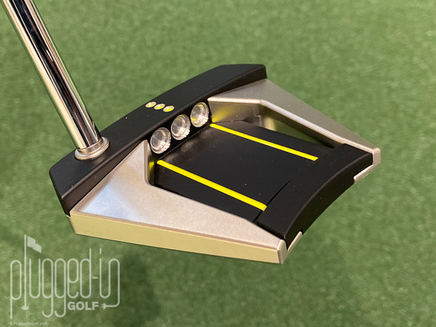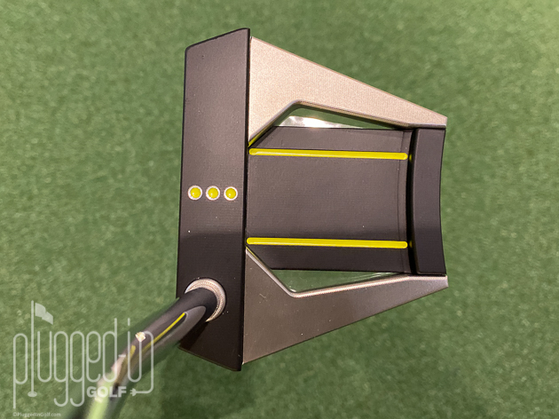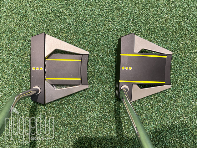 The Phantom X 6 is, in terms of shape and size, identical to the Phantom X 7. Where they differ is in their alignment aids. The Phantom X 6 (left) has a low flange, so the yellow lines stop at the back of the top line. In the Phantom X 7, the lines extend from the back of the putter all the way to the ball. I found that I had a strong preference for the continuous alignment of the Phantom X 7.