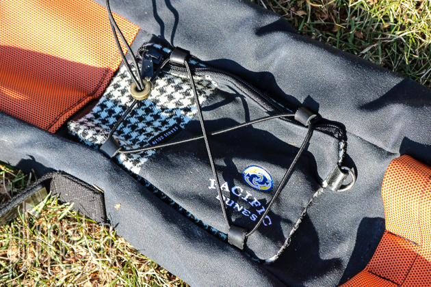 The signature feature is the bungee cord in the middle.  There’s a ton of flexibility in how you use this.  You can secure a towel, a jacket, a bluetooth speaker, water bottle…the options are limitless.  I use it to stash my valuables pouch which holds my phone, keys, and wallet while I play.