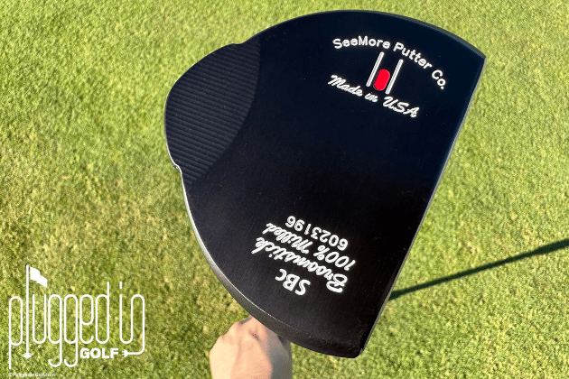 That design references one of my favorite aspects of SeeMore putter’s designs, their Rifle Scope Technology. Interestingly, the Rifle Scope Technology is not fully featured on their broomstick models. While the two white lines are visible, there is no red dot present. The sole features SeeMore’s logo and a block of text that reads: “SeeMore Putter Co. Made in USA – SBc20 – Broomstick – 100% Milled.”