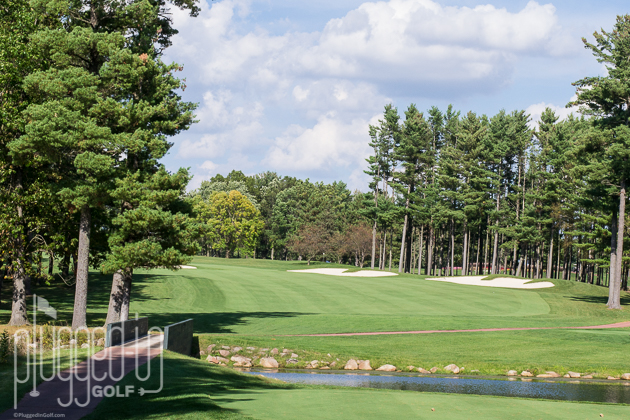 Just like the par 3s and 4s, the par 5s at SentryWorld provide you with a wide range of challenges. The most unique of the long holes is #5 (above). It starts with a tee shot over water, then continues turning left, around a copse of trees, and finally ends with an approach shot to a green flanked by water and a bunker. #9 is similarly unusual with a stream running through the hole that needs to be crossed twice.