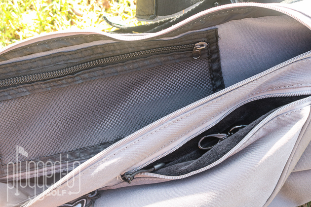 If you want a Sunday Bag with lots of storage options, this is it. The pocket you see above runs almost the length of the bag and can store two dozen balls easily. It also has a zippered mesh pocket where you can keep small items like ball markers. On the same side of the bag, there’s a velour-lined valuables pocket with a key ring clip, and third pocket for a rangefinder or tees.