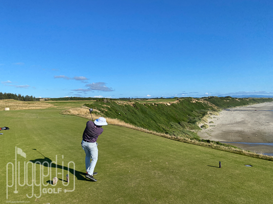 At “only” 6,636 yards from the back tees, you might think that the Sheep Ranch doesn’t demand much off the tee. You’d be wrong for two reasons. First: wind. As the course with the most ocean frontage and the least elevation, it is the most affected by the wind. Our caddie told us that he’d seen scratch players shoot in the mid 80s when the wind is up. The other reason that you can’t judge the course by the total yardage is that the par 3s and 5s are reasonably short – the longest par 5 is 549 yards and only one par 3 is over 155 yards. If the wind is down, a strong golfer can play the tips and score well. When the wind blows, the green tees at 6,245 yards will be all that most golfers can handle.