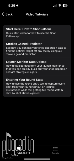 When you open the Shot Pattern app, you’re offered tutorial videos, Course Preview, Play Golf, and Account & Stats. The tutorial videos, available on Shot Pattern’s YouTube channel, are very helpful in walking you step-by-step through the different methods of data entry.