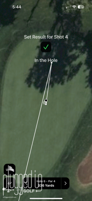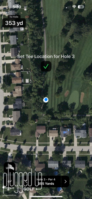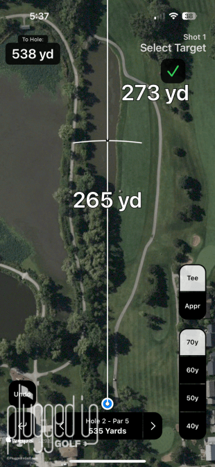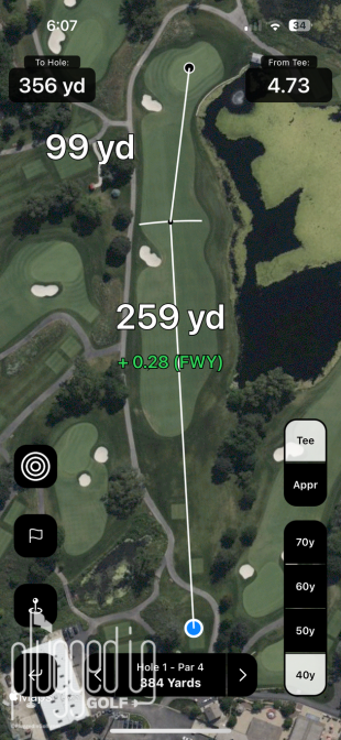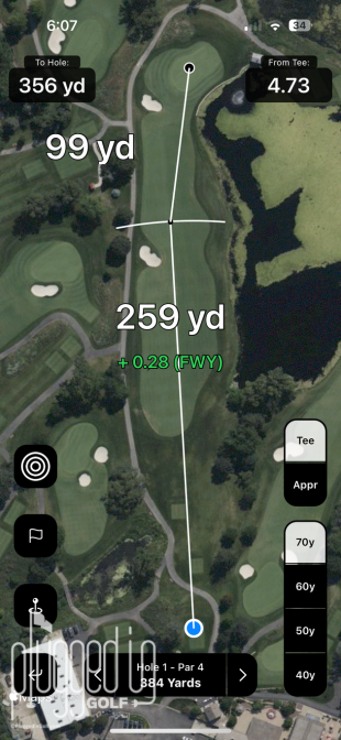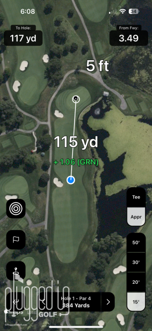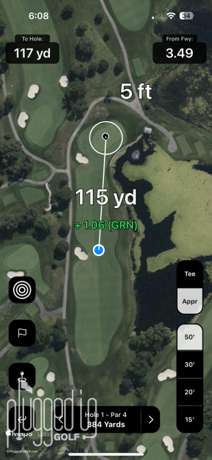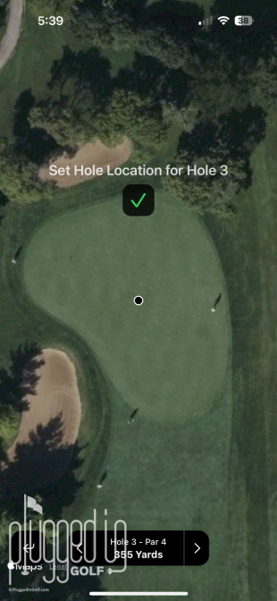 The two primary modes, Course Preview and Play Golf, both work intuitively. They start with selecting a course – Play Golf uses your location to identify nearby courses. From there, you’re presented with an overhead image of the hole (below) where you can plot out the optimal strategy.