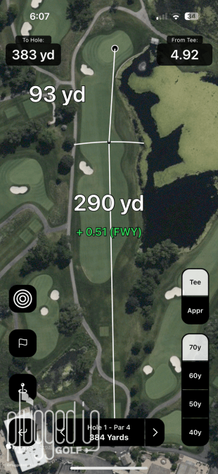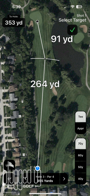 Regarding the app, I think you may be looking too hard at the screenshots in the review and not hard enough at the text (or my text is unclear – a very real possibility). Let me start fresh: when you’re standing on a tee box or previewing a tee shot, you can pick any size arc you want – 40, 50, 60, or 70 yards. You can place the target anywhere you want – any distance, fairway, rough, water, etc. Finally, if you have data put into the app, you can overlay the dispersion from different clubs (driver, 3W, etc) from the actual shots you’ve put into the app. When those actual shots are placed down, you can move the target and say, “Ok, if I hit my best ever drive, I’ll gain 0.2 strokes. If I hit my worst ever, I’ll lose 0.4. Most of my drives end up around here, and those would give me 0.0.”