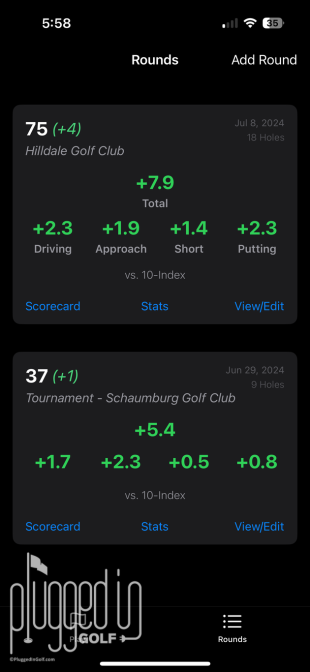 While the Course Preview/Play Golf modes will help you make good decisions, I also spend a lot of time in the post-round analysis. Above left, you see the report you get back after each round: a hole-by-hole score alongside your Strokes Gained in the four major categories. You can also see these stats for all your rounds to see how they vary (above, right).