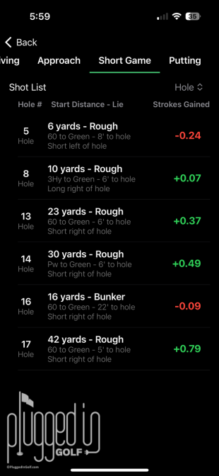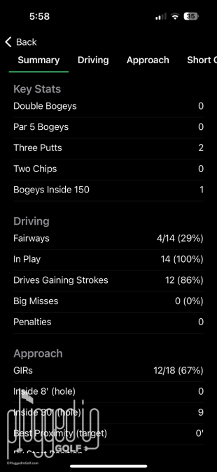 Digging to the next level, you can see a stat summary or dive into each category. As you can see above, there are numerous conventional stats like up & downs, fairways, and total putts. I find more value in the non-traditional stats, especially those off the tee. As you can see, I only hit four fairways, but twelve of my drives gained strokes (relative to a 10 handicap) due to every drive being in play, no big misses, and above average length. Let the big dog eat!