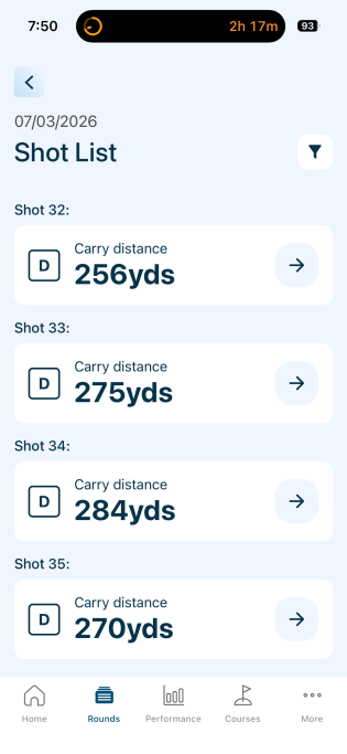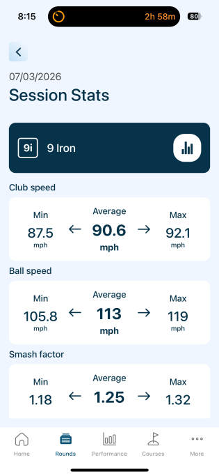 Inside the app, you can sort your shots by club, or review the entire session shot by shot. Looking at each club shows you the minimum, maximum, and average for each of the five data points. This fairly simple functionality has major benefits to your understanding of your game. Knowing your true average and your range of distances with each club can elevate your course management and scoring.