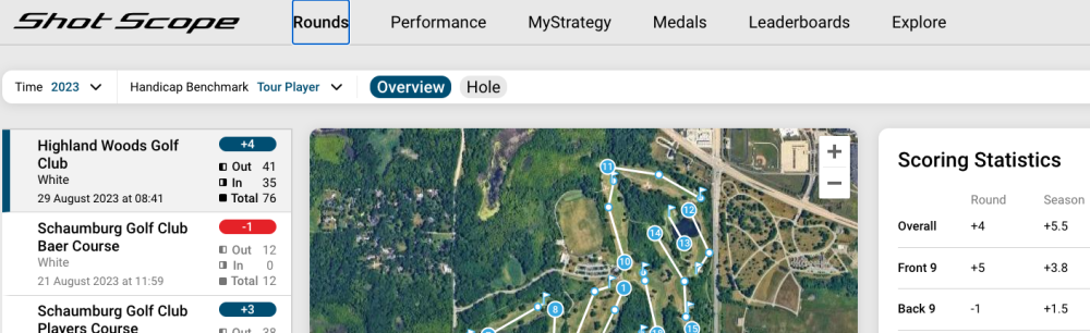 When you log in to your Shot Scope dashboard, you’ll see the MyStrategy tab at the top between Performance and Medals. Click on that, and you’ll be prompted to choose a course and a set of tees.