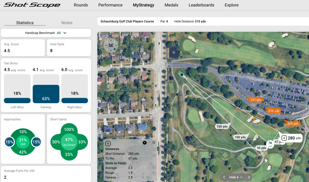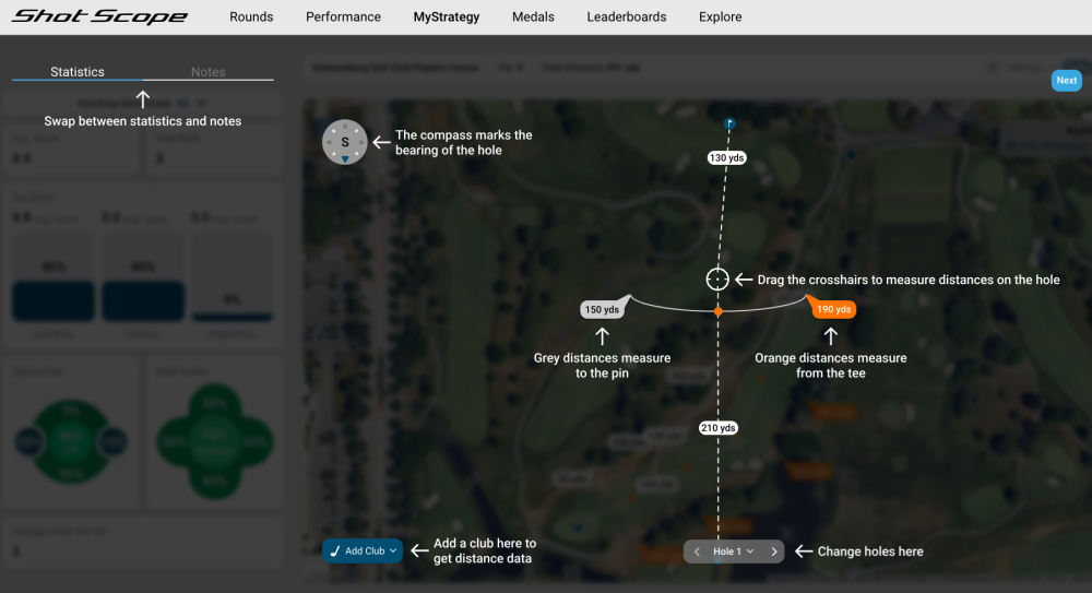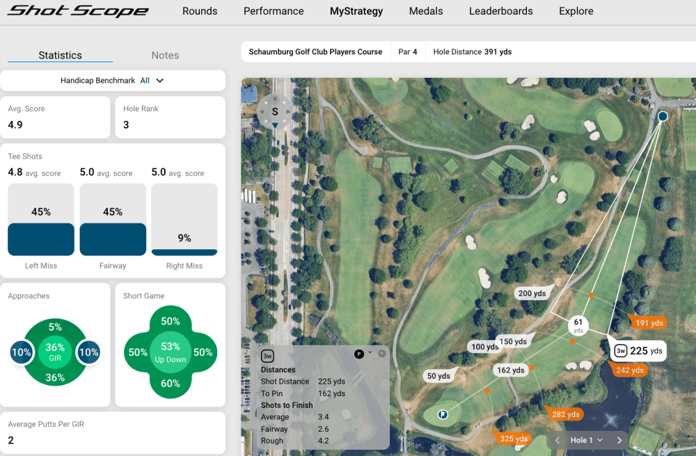 Shot Scope MyStrategy is a brilliant, easy-to-use platform for applying your shot tracking data to your on course strategy. Free! Find the right club and target line while learning more about the impact of elevation and wind.