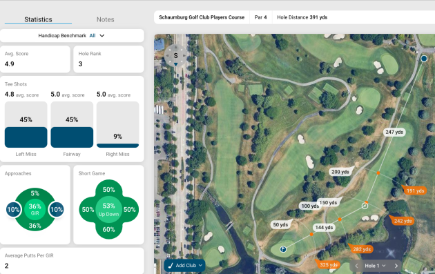 To work on your own strategy, click the “Add Club” button on the bottom of the screen and choose the club you want to hit off the tee. A box will appear in the bottom left that shows the range of different expected scores based on where your tee shot lands. You can move your target line to see different ways to fit your shot pattern onto the fairway.