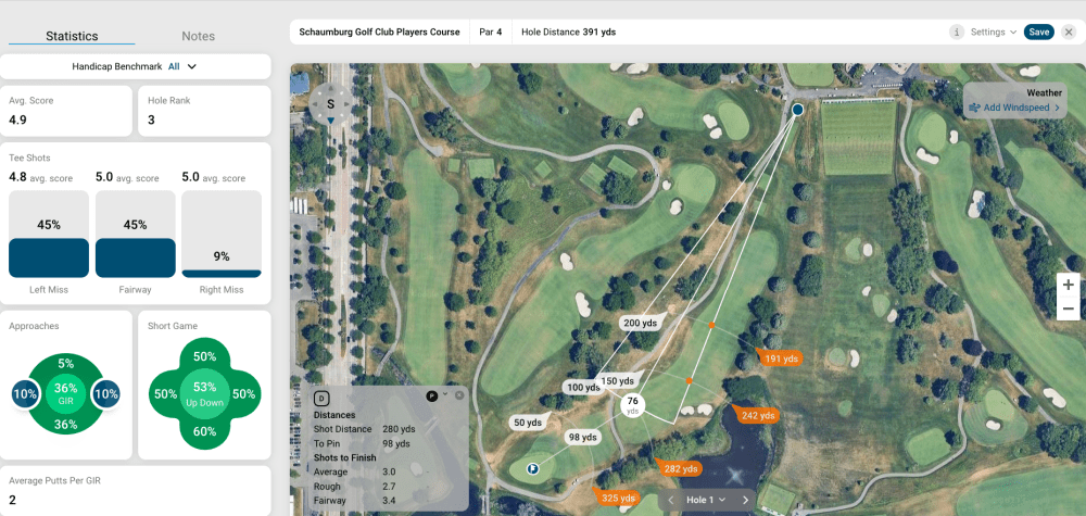 From there, you can move through aerial views of all 18 holes. When the hole comes up, you’ll see Shot Scope user data on the left hand side. This includes the average score, hole rank, tee shot accuracy, approach accuracy, and short game data.