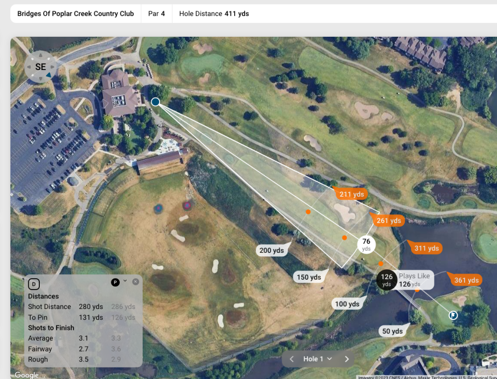 If I want to hit driver off the tee, I need to shift my target line completely off the fairway. While this may look goofy from the tee, the view from MyStrategy shows that this is clearly better. The bunkers are no longer in play. Yes, more shots may end up in the rough, but there’s no tree trouble unless I also hit it well short of my Performance Average (the average of the last 30 tee shots with this club).