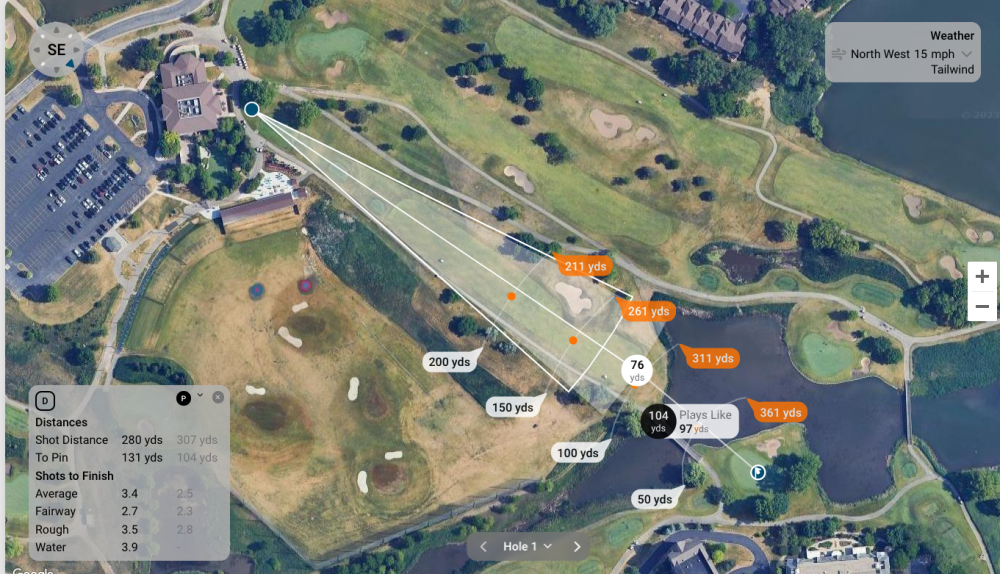 Above is the first hole at another local course. The hole plays downhill, so I turned on the elevation adjustment to see how much that affects my strategy. Shot Scope estimates it will add 6 yards to my drive, which shouldn’t bring any additional trouble into play. In this case, the elevation doesn’t change things too much. However, when I turned on the wind (below), I brought the water into play off the tee. As much as I hate keeping driver in the bag, the threat of the water (and a 1.2 stroke expected loss) would lead me to hit 3W here.