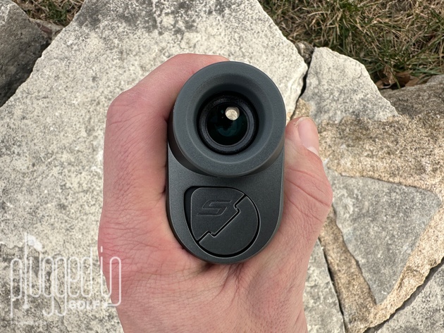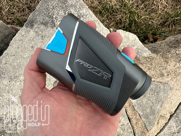 While I normally start with speed and accuracy, the construction of the Shot Scope PRO ZR demands to go first. Shot Scope calls the body DuraShield Hardshell, and that’s a fitting name. In hand, it feels quite different than Shot Scope’s other lasers like the Pro L2 [review HERE]. Rumor has it that the PRO ZR can even get run over by a golf cart and continue functioning, though Plugged In Golf does not endorse such behavior. From the overall solid construction to the quality of the button pushes, everything about the PRO ZR feels top shelf.