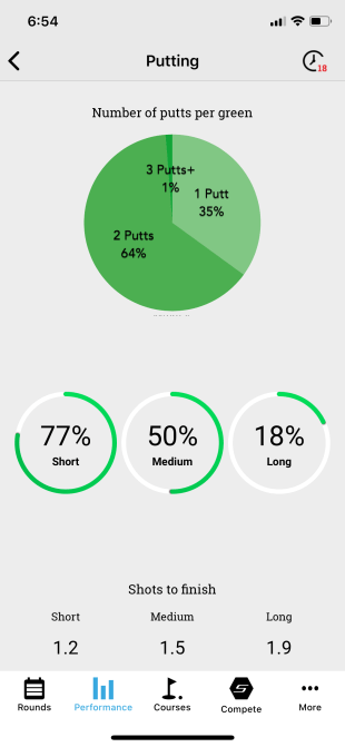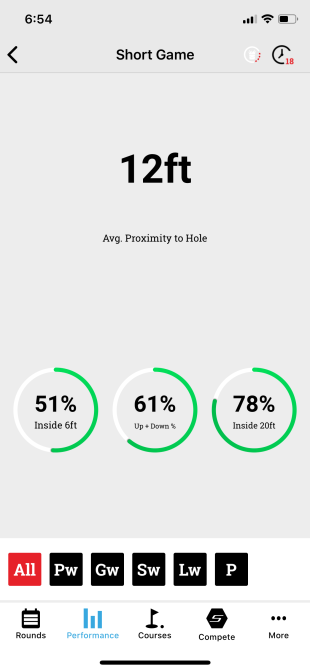 Shot Scope offers the most statistics, and they continue to add more. From the app, you can see your stats in Tee Shots, Approaches, Short Game, and Putting, with each broken down by club, if you choose. On desktop, you can get even more granular with your analysis. To this, Shot Scope is adding Strokes Gained statistics later this year. For those that want a game-ified experience, Shot Scope also offers badges that you can earn for on-course achievements and leader boards where you can compare your game to others.