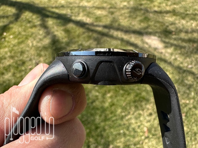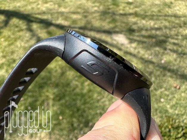 The Shot Scope X5 works with two buttons – one of which spins – and a touchscreen. The buttons generally operate as forward/select and back. You can choose whether you scroll through menus with the touchscreen or the spinning button. The 1.2″ color screen is bright and easy to read.