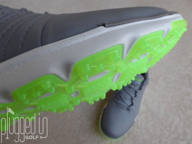 Calling the Go Golf Elite-Tour SL spikeless does them a disservice. True, they don’t have cleats, but the outsole is one of the most aggressive I’ve encountered. I was willing to drive to the golf course wearing the shoes, but I wouldn’t want to walk around on someone’s nice hardwood floors in them. The four sections down the front center are reminiscent of a meat tenderizer tool.