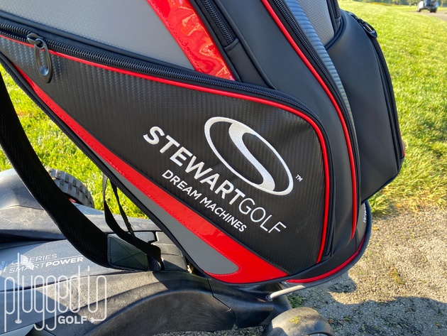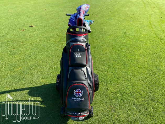 I tested the Q Follow with the Stewart Staff Pro Cart Bag, and it’s a perfect match. The Staff Pro Cart Bag has a 9.5″ top with 14 full-length dividers and an external putter tube. It also has more storage than any bag I’ve ever tested including a cooler pocket and waterproof valuables pocket. You can bring an extra two dozen balls, full rain suit, lunch, dinner, a six-pack, and you probably still won’t reach its capacity.