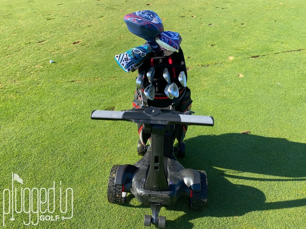 When you reach the course, getting the Stewart Golf Q Follow rolling is quick and easy. Unfold it, set your bag on it, flip the battery switch on, and turn on the remote. In under a minute, you’ll have your cart powering itself to the club house.